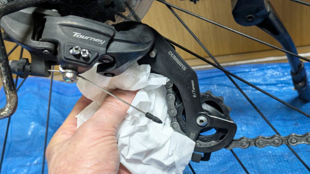 帰宅時は、この方がディレイラーに負担が掛からないかな、と期待してトップギヤ(7速)にしています。これを、プーリーを拭きやすくするため、ローギヤ(1速)にします。
