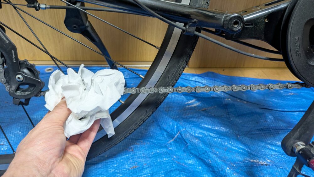 両手がふさがるので写真が撮れなかったのですが、左手でティッシュ3枚を持ってチェーンの下に添えながら注油しています。