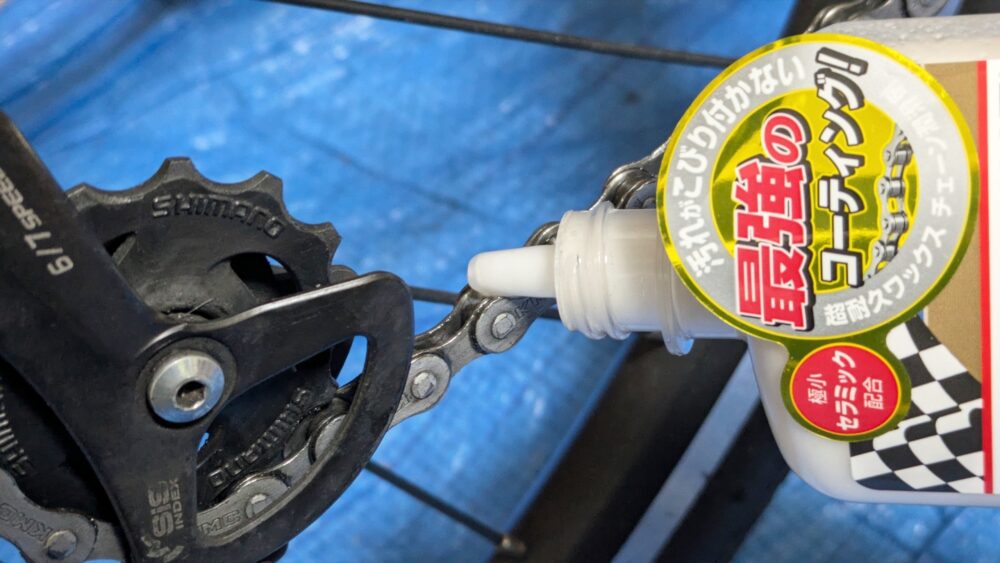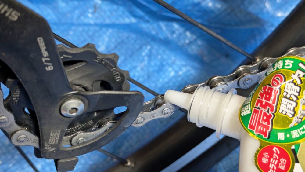 ローギヤ(1速)の状態で下に通っているチェーンのつなぎ目部分、25箇所程度に、ボトルから直接注します。